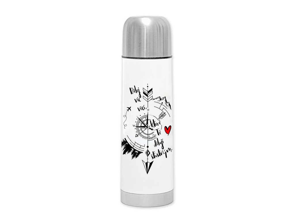 Tato termoska klasik je inspirací pro každodenní dobrodružství! Motiv "Dělej více věcí, které tě dělají šťastným" v kombinaci s designem kompasu, hor, letadla a lesa vás neustále motivuje, abyste se vydali ven a užívali si každého okamžiku.